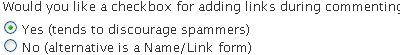 "Would you like a checkbox for adding links during commenting?"This option lets you choose between the Name/Link form that many visitors are accustomed to, or the checkbox-style that some visitors find confusing. The checkbox has a twist to it, though. If a visitor tries to leave a comment without checking the box, they'll be reminded before it's too late. So given that little feature, you might find that you get less link-and-run behavior using the checkbox. But again, you have a choice of either style. |