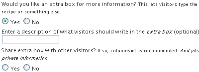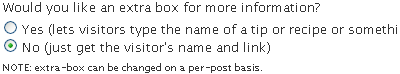 "Would you like an extra box for more information?"This is something you might want to leave turned off for now and choose to turn it on for individual posts. But again, it's all up to you! When it's turned on, visitors can type whatever they want, whether that's a tip or a recipe or some other information. Use your imagination and have fun with this! One thing I'll point out now is that in general, only you, the administrator, get to see what each user has typed into the "extra" Box -- that is, unless you decide to share that, and that is settable on a post-by-post basis. |