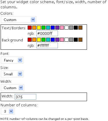 "Set your widget color scheme, font/size, width, number of columns."This is nearly self-explanatory. For color schemes, you have black-on-white or white-on-black to select from, or you can make your own by selecting Custom and clicking the colors you'd prefer (or typing them in using the #RRGGBB format). You also have two choices of fonts, which I've labeled plain and fancy, and you can also type in something else in the format that CSS is accustomed to. And then you get to pick the size of the font, the width of the widget box, and the number of columns. The preview will show you pretty much how it will look on the screen, so play around with the settings until you find something you like. |