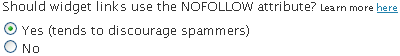 "Should widget links use the NOFOLLOW attribute?"There is a link where you can read more about this attribute, but it boils down to whether or not your visitors' links are counted by search engines or not. If you say Yes, your visitors' links will NOT be counted, which is bad news for spammers, who are trying to leave their links all over the place and boost their rankings. |