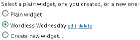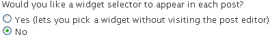 "Would you like a widget selector to appear in each post?"This is one of those features I had to add, but even I don't know if I like it, and that's why you get to choose whether it's on or off. If you choose Yes, the red-dashed box will appear on the screen, but only you, the administrator, will be able to see it. You can use it to select, for any given post, whether there should be a widget and if so, which type of widget (or game or meme, for example) will be shown -- all without having to go to the post editor, where you can also set that up. I'd recommend trying it both ways and seeing which way you like better. |