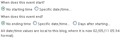 "When does this event start/end?"This should be fairly self-explanatory, but let me mention a couple things: if the date turns red while you're typing, don't worry -- the system is trying to parse as you type. Another thing to bear in mind is the current time. You may live on the west coast but your server is in Texas -- all times are based on the server, so take a peek at what the plug-in says the time is, and you can adjust accordingly. |