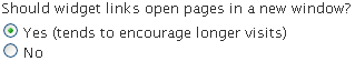 "Should widget links open pages in a new window?"If you answer Yes, a new browser window (or tab) will open whenever a visitor clicks one of the links in your widget. This is usually a good idea, because then your blog is still in its own window, so that when the visitor is done with that other site and they close that window, they'll still be visiting you. |