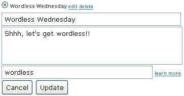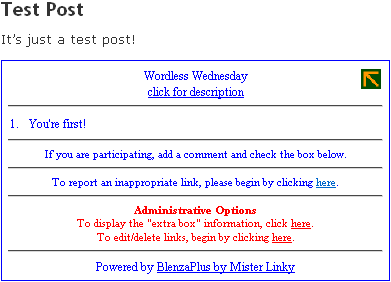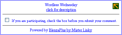 "Select a plain widget, one you created, or a new one"This is like selecting a meme if you're familiar with Mister Linky's Original Auto-Linky (and other) widgets, only simpler! Each widget you define has a name and a description, so people know what your widget is for and what the rules are for participating. Update: There's already something new and it's only Beta 2!! If you configured the plug-in to connect to visitors' links, the system will reject comments with links that are just plain broken. However, it can also validate the content behind the link and help you decide whether or not a link belongs to a legitimate participant. Here's how it works: Let's say you're creating a widget for Wordless Wednesday. If you want to make sure that each participating post contains the word "wordless" you'll simply create a validator that says "wordless". You could be more clever and design a regular expression that looks for a picture that has a title that includes the word "wordless" -- that's up to you! Keep in mind that the less that spammers know about this, the better, so it's best to avoid mentioning the validation process to your visitors. Just let them play along and enjoy a spam-free environment! ::knock on wood:: |